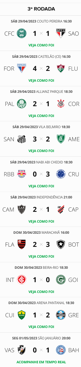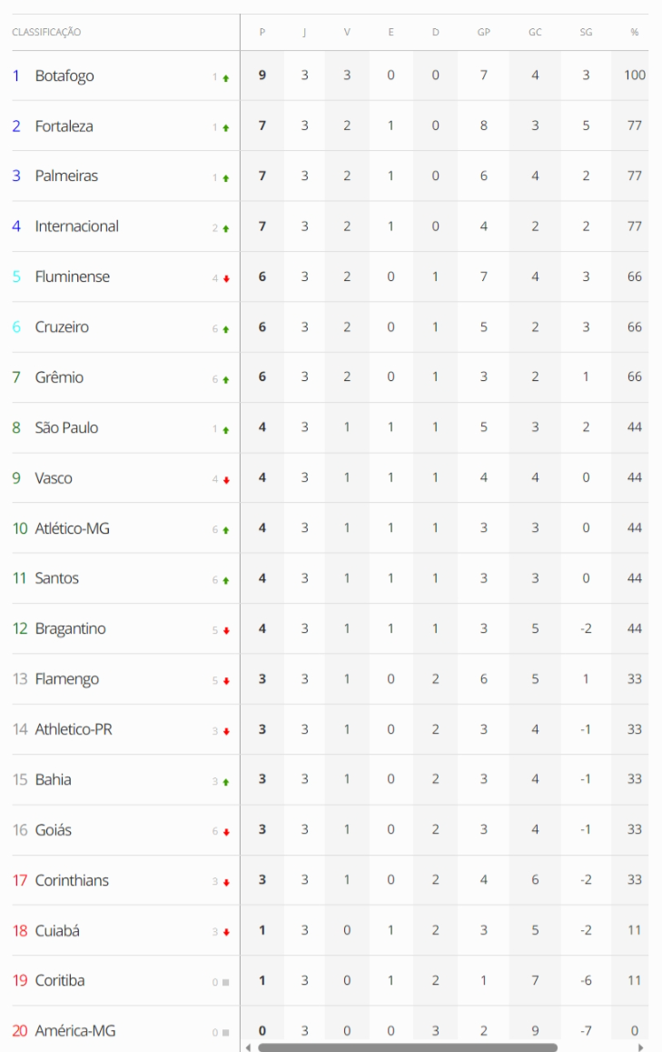 Terminada a 3ª rodada do Campeonato Brasileiro, o Vasco, que foi derrotado pelo Bahia por 1 a 0, está na 9ª colocação, tendo perdido 4 posições em relação ao fim da 2ª rodada.