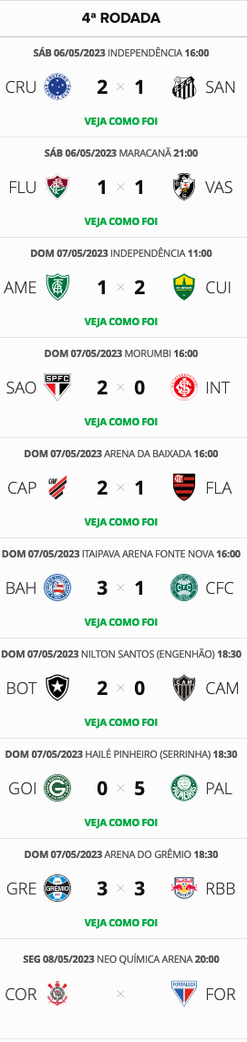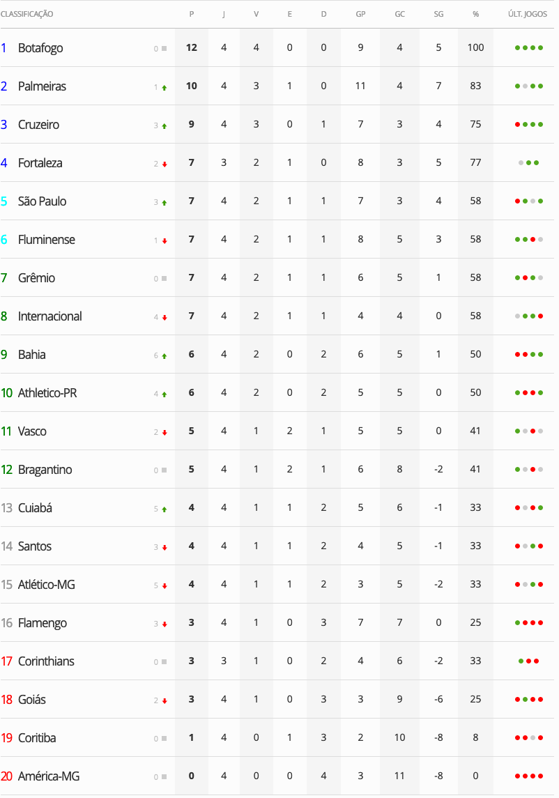 Confira a classificação do Campeonato Brasileiro após os jogos de domingo da 4ª rodada.