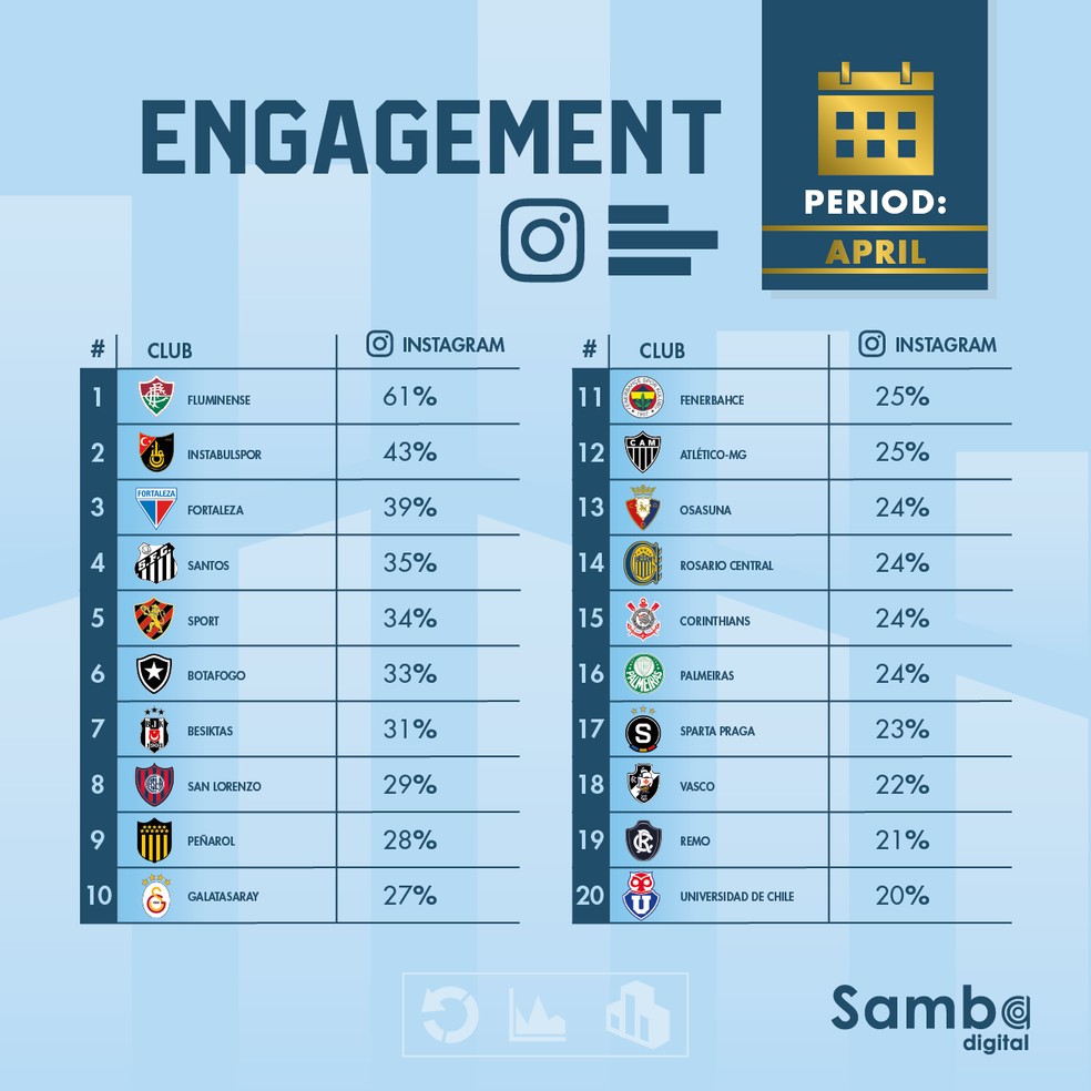 O engajamento é calculado através de uma média de interações (likes, curtidas, encaminhamentos) com relação à própria quantidade de seguidores. Com isso, torna-se possível fazer um comparativo direto entre as contas independentemente do número de seguidores de cada clube. O Fluminense teve 61% da taxa de engajamento no "Instagram" em abril, 18% a mais que o Istanbulspor, da Turquia, o segundo colocado (veja o ranking na tabela acima).
