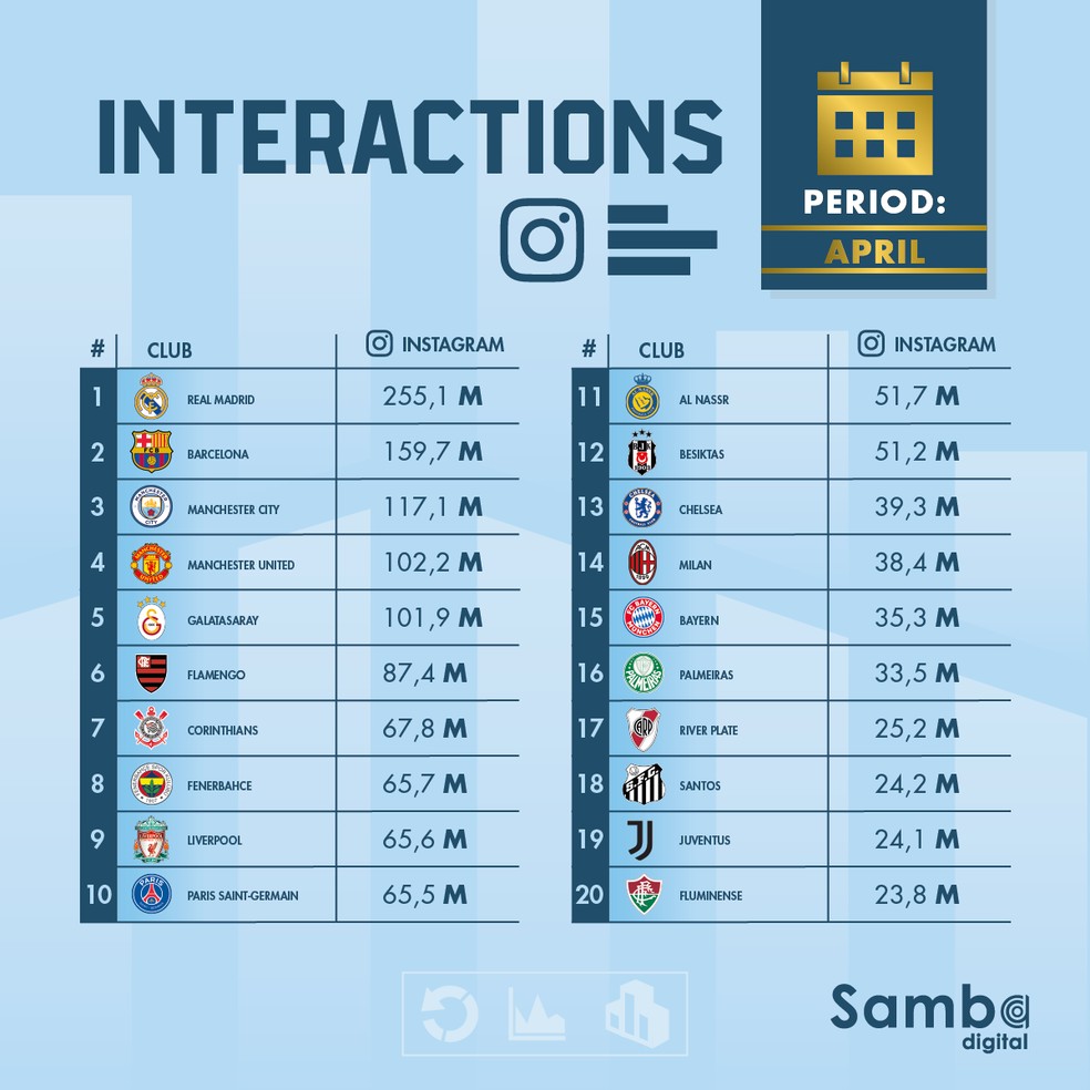 Além disso, o Fluminense também apareceu em abril como o 20º clube do mundo com maior número de interações totais ao somar 23,8 milhões. Entre os times brasileiros, só ficou atrás de Santos (24,2 milhões), Palmeiras (33,5 milhões), Corinthians (67,8 milhões) e Flamengo (87,4 milhões). O líder geral do ranking foi o Real Madrid, da Espanha, com 255,1 milhões (veja na tabela abaixo).
