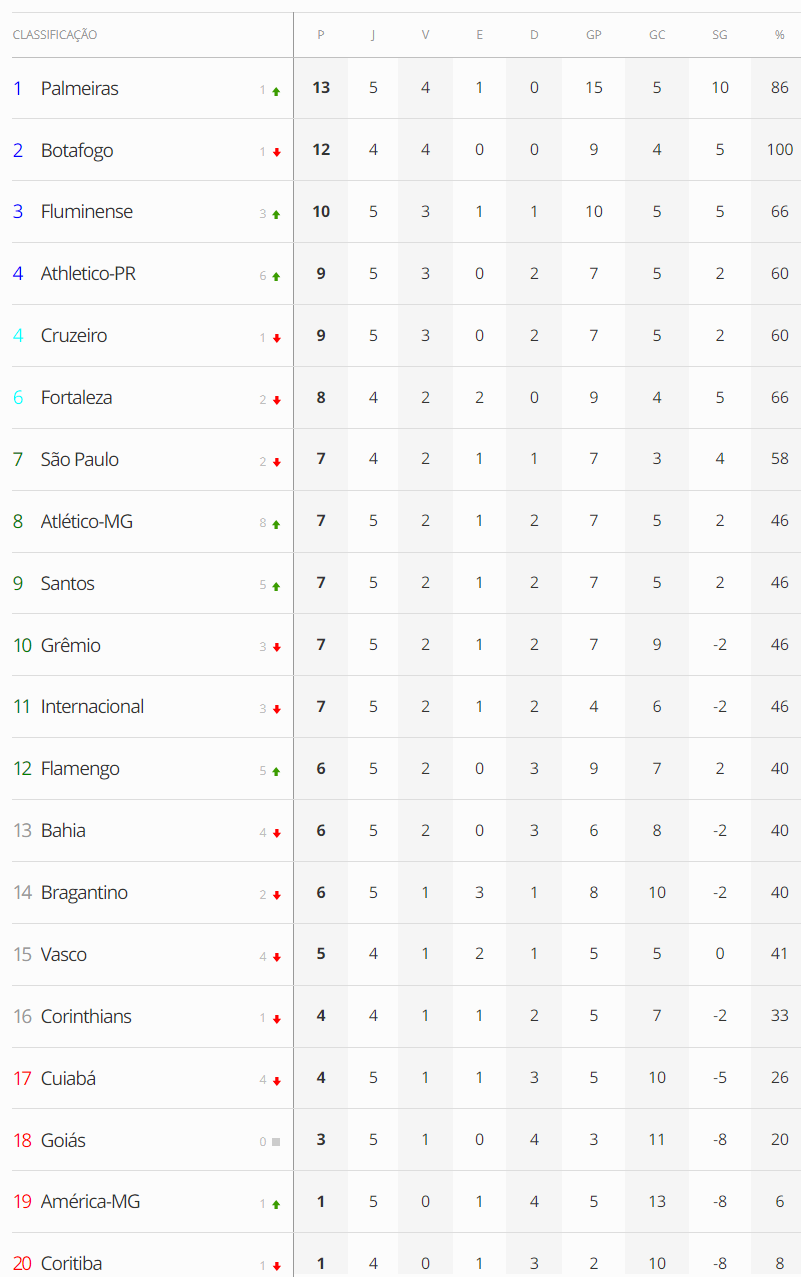 Confira a classificação do Brasileiro após os jogos de 4ª-feira da 5ª rodada; Vasco está na 15ª posição