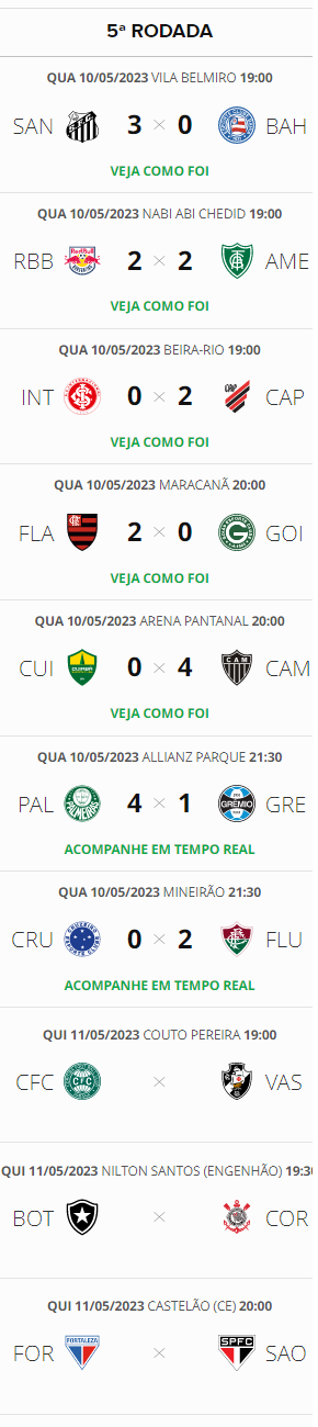 A 5ª rodada do Campeonato Brasileiro se iniciou nesta 4ª-feira com 7 jogos. O Vasco está na 15ª colocação e enfrenta o Coritiba nesta 5ª-feira às 19h no Couto Pereira.