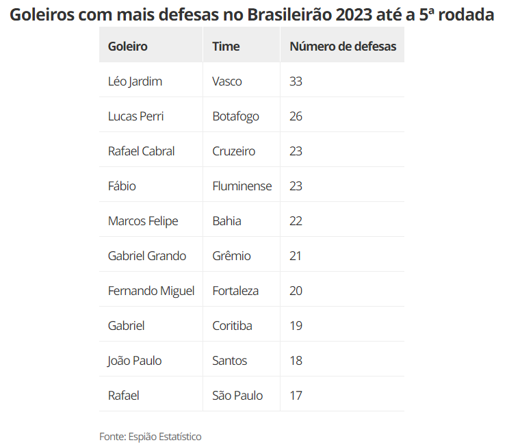 Léo Jardim é com folga o goleiro com mais defesas nas primeiras cinco rodadas do Campeonato Brasileiro. De acordo com levantamento de Guilherme Marçal e João Guerra, do Espião Estatístico, foram 33 até o momento. Ele é seguido de longe por Lucas Perri, do Botafogo. Com 26 defesas, o goleiro alvinegro também tem sido destaque nesse início de Brasileirão.