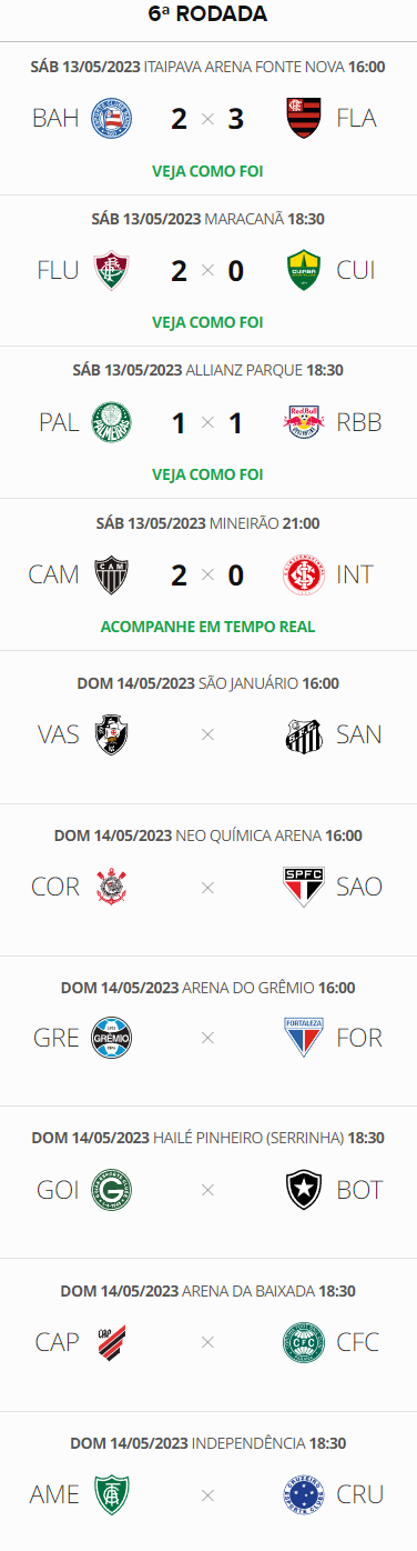 Confira a classificação do Brasileiro após os jogos de sábado da 6ª rodada