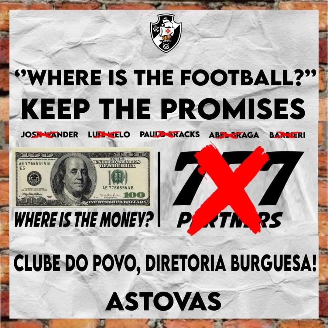 A Associação das Torcidas Organizadas do Vasco vem por meio desta nota demonstrar seu repúdio a forma como a 777 Partners está gerindo o futebol do Vasco da Gama.