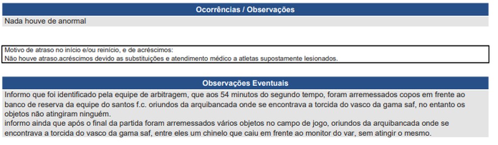 O árbitro também relatou que, após a partida, foram arremessados vários objetos no campo de jogo, entre eles um chinelo que caiu em frente ao monitor do VAR, sem atingir o monitor.