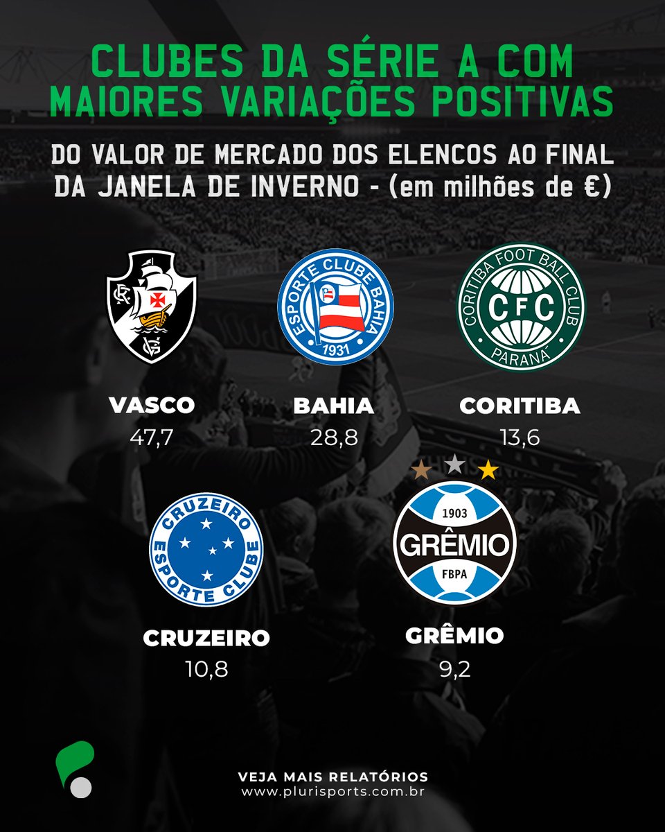 Os 4 clubes que subiram para a Série A, estão entre as 5 equipes que mais aumentaram o valor de mercado dos elencos ao final da janela de transferências de inverno.