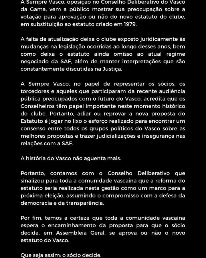 A Sempre Vasco, no papel de representar os sócios, os torcedores e aqueles que participaram da recente audiência pública preocupados com o futuro do Vasco, acredita que os Conselheiros têm papel importante neste momento histórico do clube. Portanto, adiar ou reprovar a nova proposta do Estatuto é jogar no lixo o esforço realizado para encontrar um consenso entre todos os grupos políticos do Vasco sobre as melhores propostas e trazer judicializações e insegurança nas relações com a SAF.