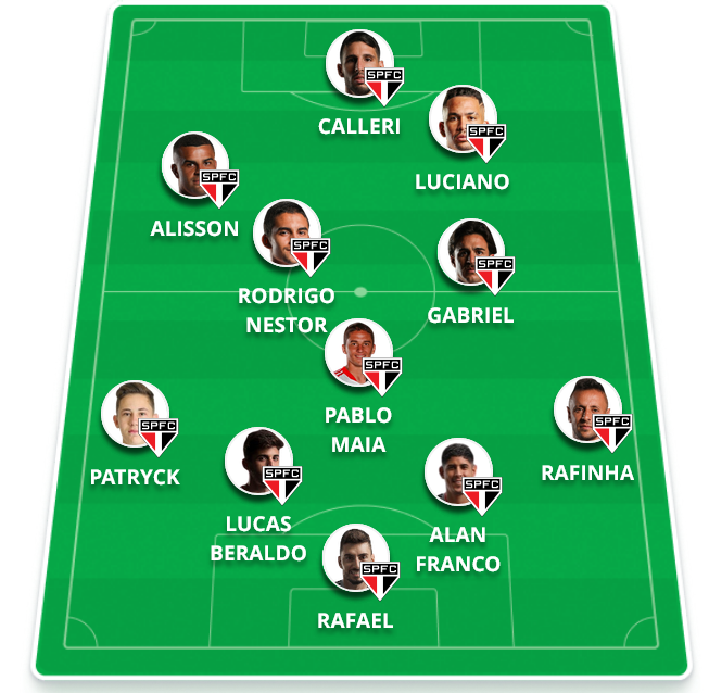 Provável escalação: Rafael; Rafinha, Alan Franco (Diego Costa), Beraldo e Patryck (Caio Paulista); Pablo Maia, Gabi Neves, Rodrigo Nestor e Alisson; Luciano (Marcos Paulo) e Calleri.