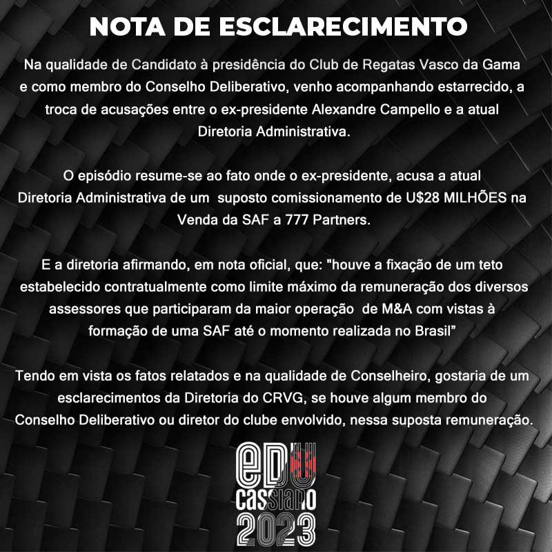 Candidato à presidência do Vasco, Eduardo Cassiano deseja saber se houve remuneração a assessores no processo da SAF