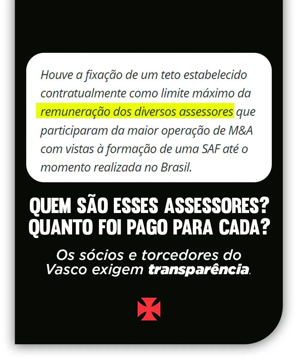 Ao se defenderem da acusação de que receberam comissões por venderem o futebol do Vasco, a diretoria lançou uma nota afirmando que houve uma "fixação de um teto estabelecido contratualmente como limite máximo da remuneração dos diversos assessores que participaram da maior operação de M&A (fusões e aquisições) com vistas à formação de uma SAF até o momento realizada no Brasil".