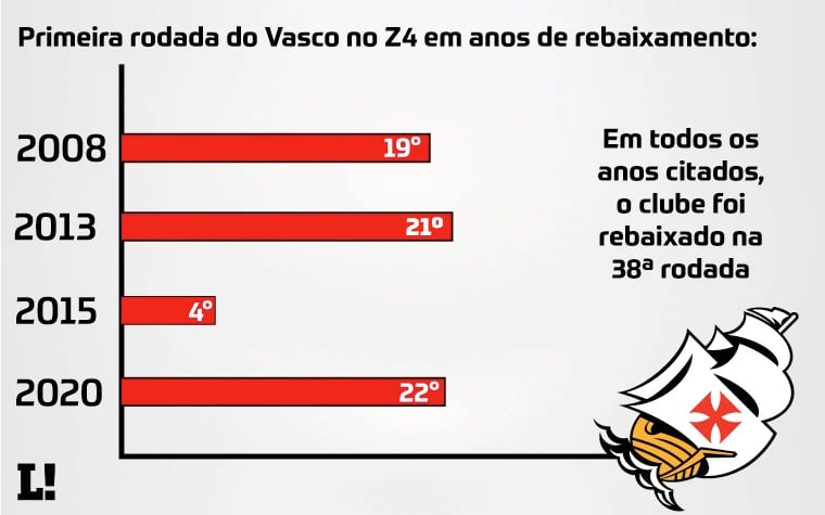 Relembre em que rodada o Vasco entrou no Z4 nos anos em que foi rebaixado