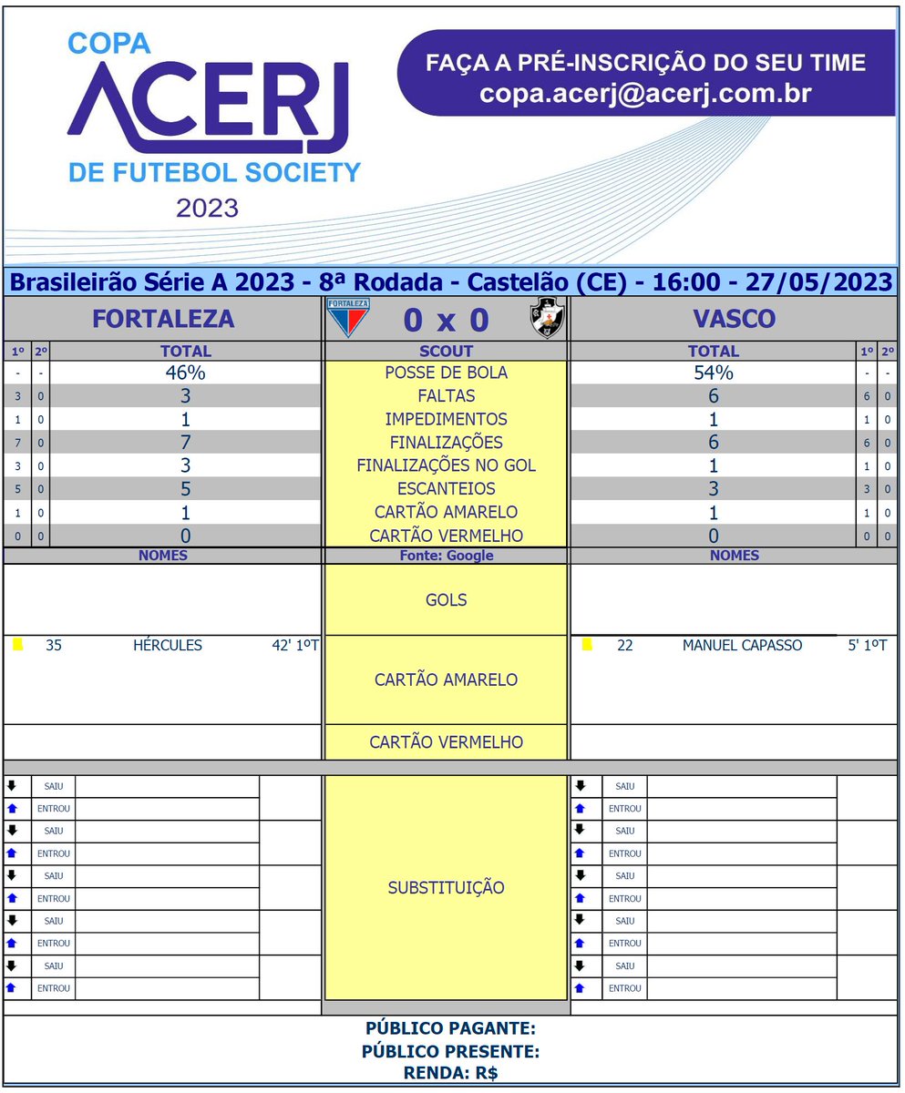 Scout do 1º Tempo de Fortaleza e Vasco pela 8ª Rodada do Campeonato Brasileiro 2023 no Castelão (CE)(Fonte: Google) #Acerjinforma #Brasileirao #FORxVAS #FortalezaEC #Vasco @Brasileirao @FortalezaEC @VascodaGama