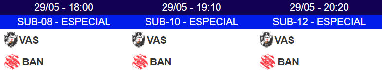 Pelos Campeonatos Cariocas, de Futsal de base, o Vasco enfrenta o Bangu em 3 categorias nesta 2ª-feira, a partir das 18h, em São Januário.