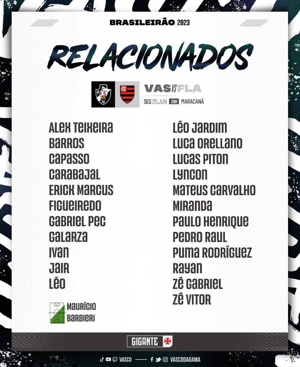 Veja os relacionados do Vasco para o jogo contra a Urubu; Robson é desfalque; Zé Gabriel e Lyncon são as novidades
