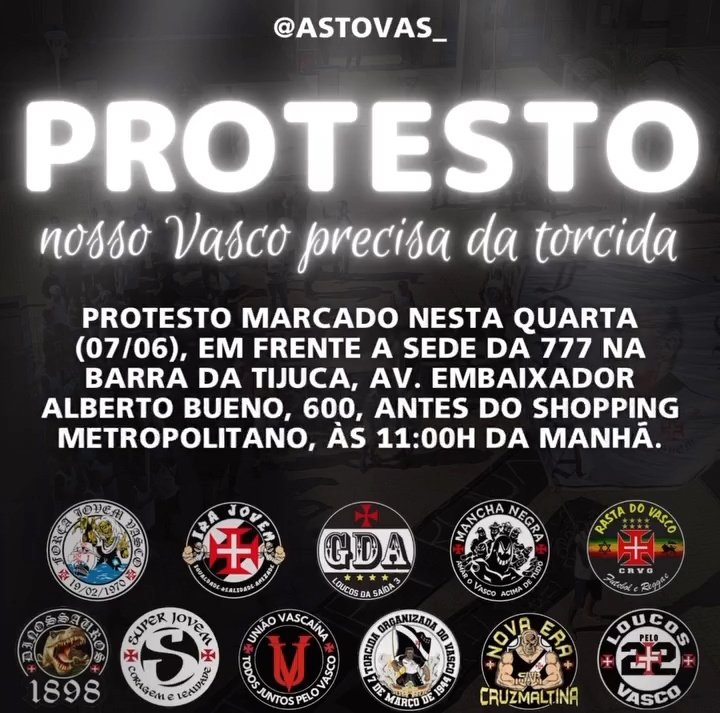 A Associação das Torcidas Organizadas do Vasco divulgou que fará um protesto amanhã, às 11h, em frente a sede da 777, na Barra da Tijuca.