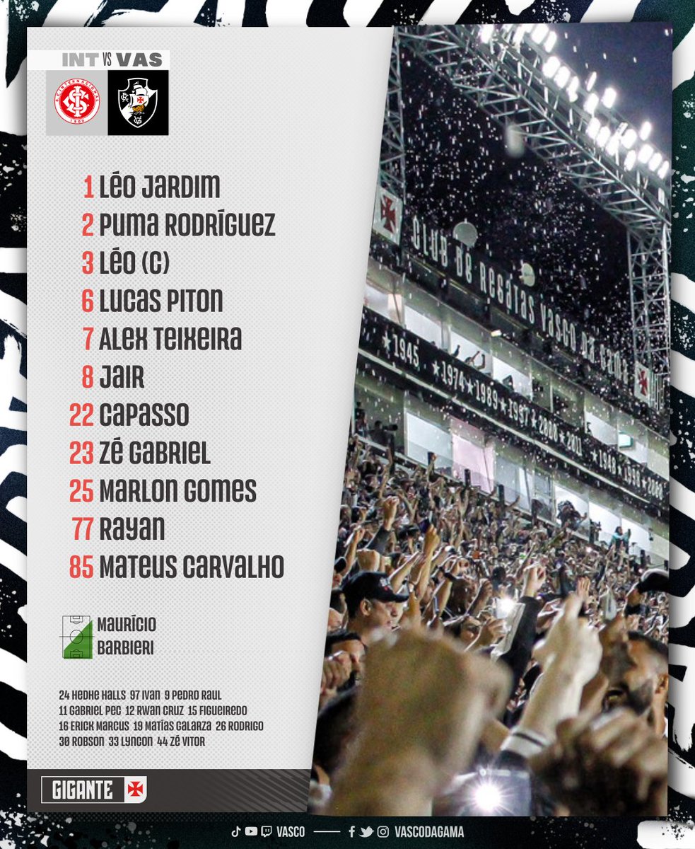Confira a escalação do Vasco para o jogo contra o Internacional; Mateus Carvalho, Zé Gabriel e Rayan são as novidades