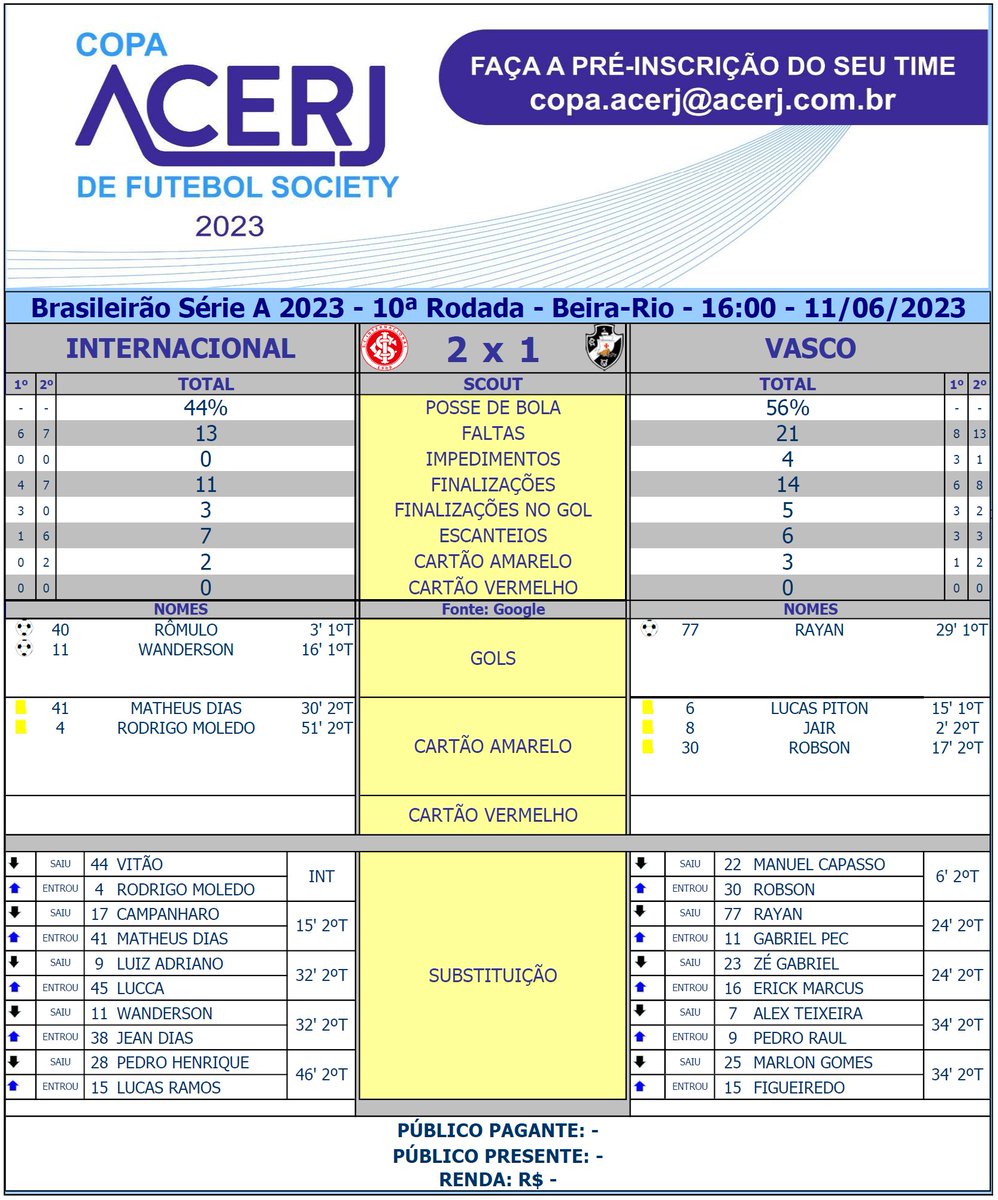 Cartão amarelo: Lucas Piton, Jair e Robson (Vasco) e Matheus Dias e Rodrigo Moledo (Internacional)