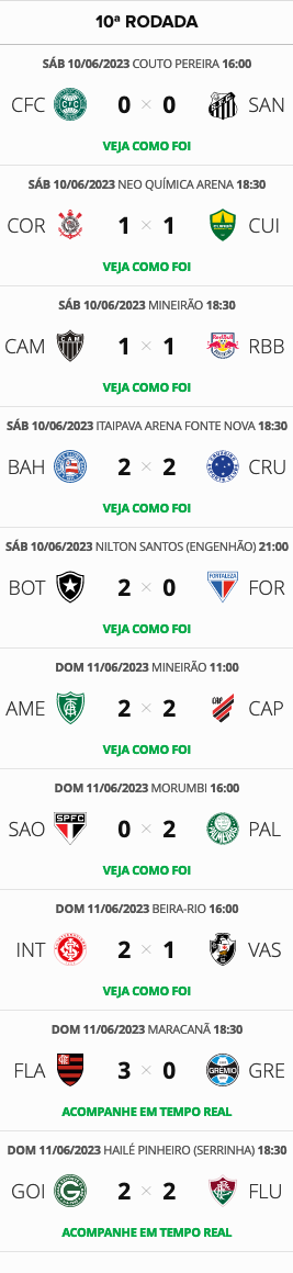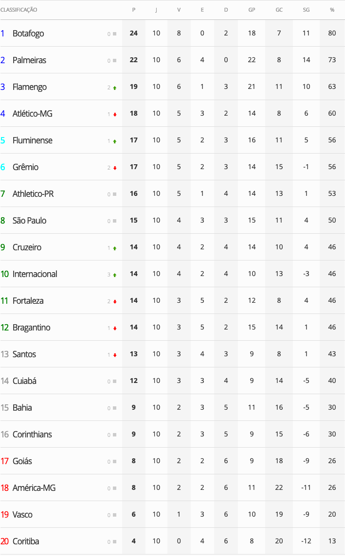 Terminada a 10ª rodada do Campeonato Brasileiro, o Vasco, que perdeu para o Internacional por 2 a 1, segue na 19ª e penúltima colocação.