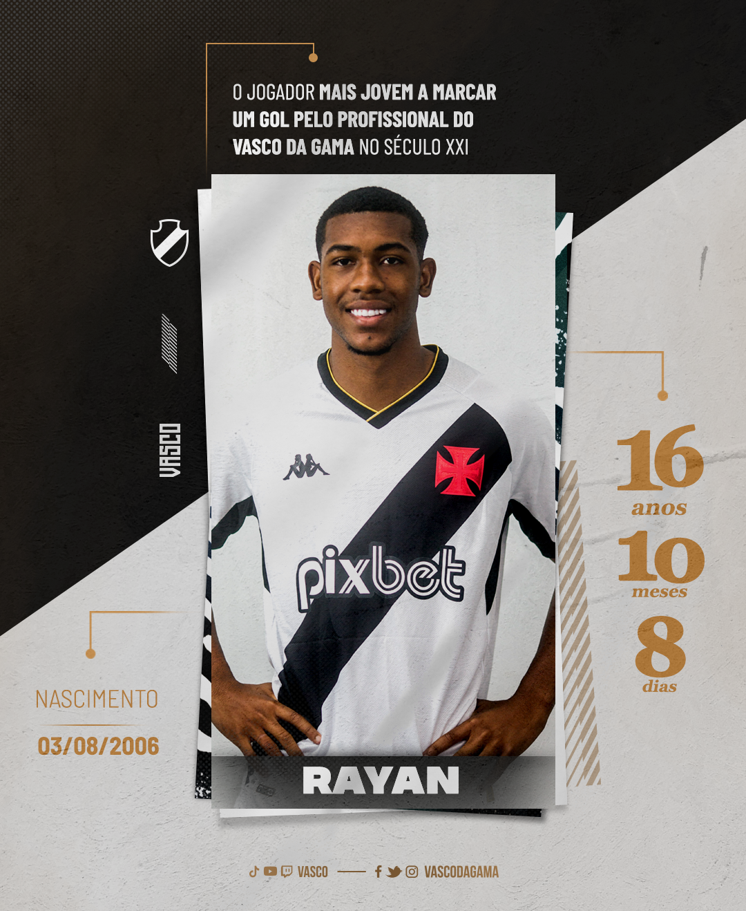 – Muito feliz pela oportunidade de vestir essa camisa e marcar meu primeiro gol como atleta profissional pelo Vasco, sendo o mais jovem do século. O placar não foi o que queríamos, mas seguimos trabalhado firme para que os resultados venham. Toda honra e toda glória ao Senhor – afirmou Rayan.