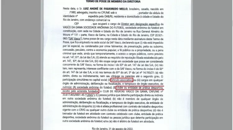 No documento firmado há o impeditivo em ter "vínculo associativo com clube ou entidade de prática esportiva, exceto pelo acionista fundador", neste caso, o Vasco. Ele foi assinado em 31 de agosto de 2022.