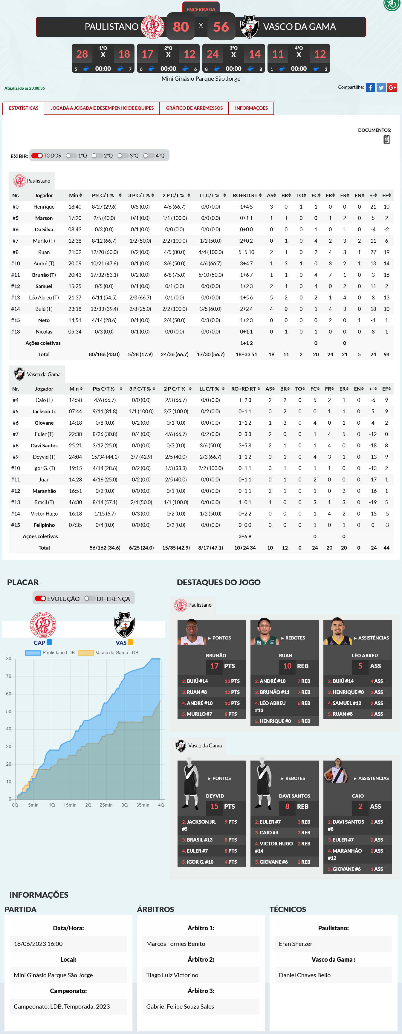 O Paulistano começou a LDB 2023 a todo vapor e venceu o Vasco por 80 a 56. A equipe comandada por Eran Sherzer abriu uma vantagem de 10 pontos logo no primeiro quarto, e só aumentou essa diferença ao longo da partida. O placar final foi 80 a 56.