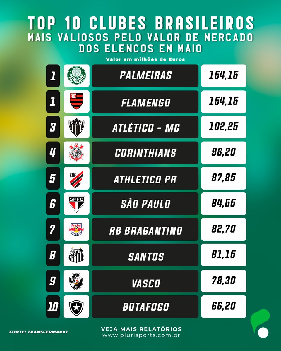 No mês de maio, Palmeiras e Flamengo terminaram com elencos de valores equivalentes. Juntamente com o Atlético-MG, são os únicos clubes brasileiros com valores acima de 100 milhões de Euros.