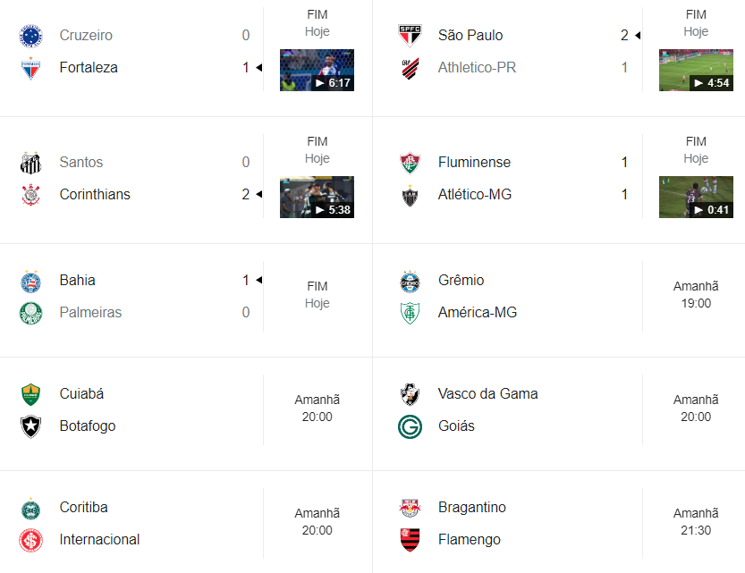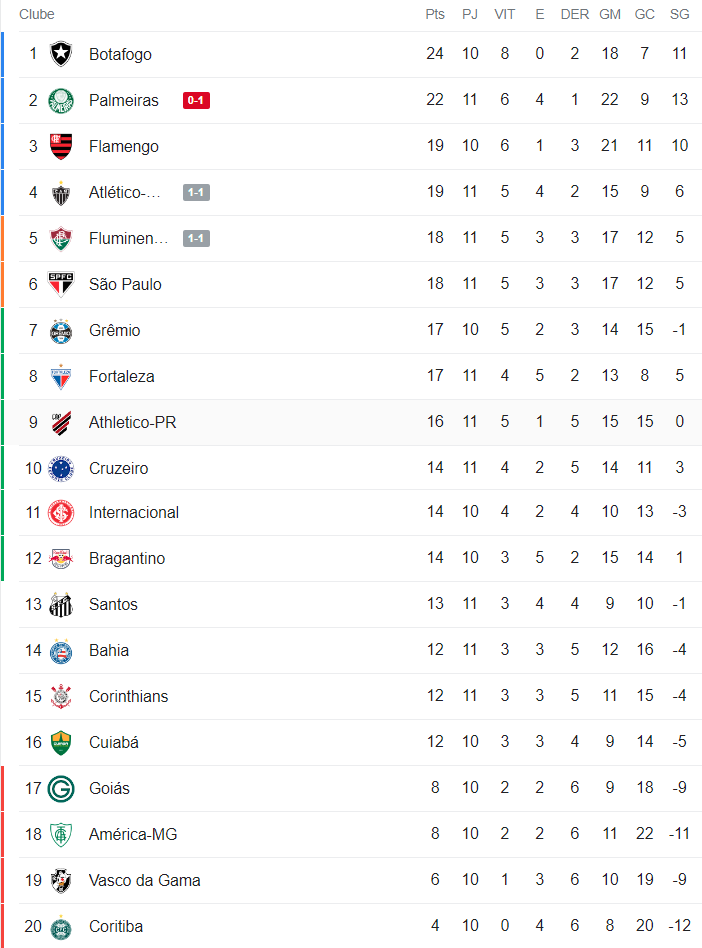 Cinco jogos abriram a 11ª rodada do Campeonato Brasileiro nesta 4ª-feira. A vitória do Bahia sobre o Palmeiras acabou com qualquer chance de o Vasco deixar a zona do rebaixamento nesta rodada. O Vasco enfrenta o Goiás nesta 5ª-feira às 20h em São Januário.