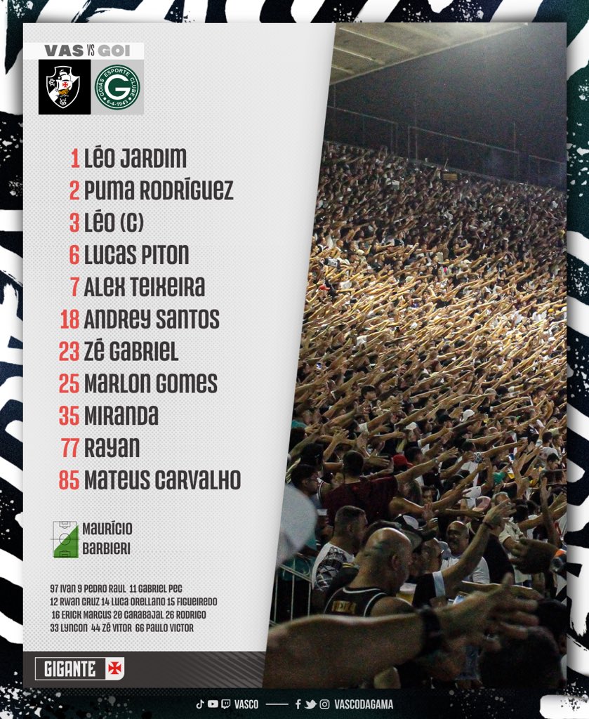 Confira a escalação do Vasco para o jogo contra o Goiás; Miranda, Andrey Santos e Puma Rodríguez estão confirmados