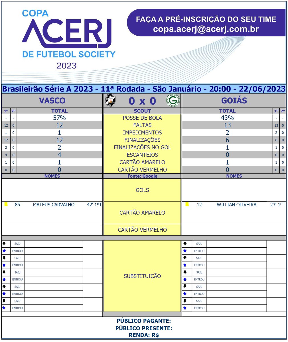 Scout do 1º Tempo de Vasco e Goiás pela 11ª Rodada do Campeonato Brasileiro 2023 em São Januário (Fonte: Google) #Acerjinforma #Brasileirao #VASxGOI #Vasco #GoiasEC @Brasileirao @VascodaGama @goiasoficial