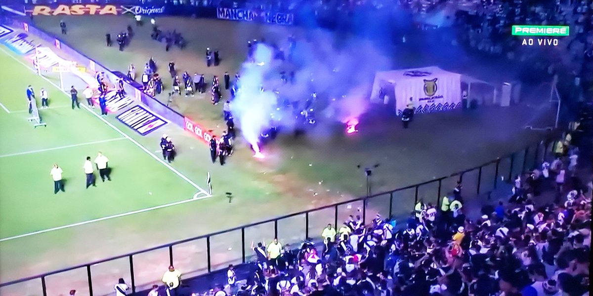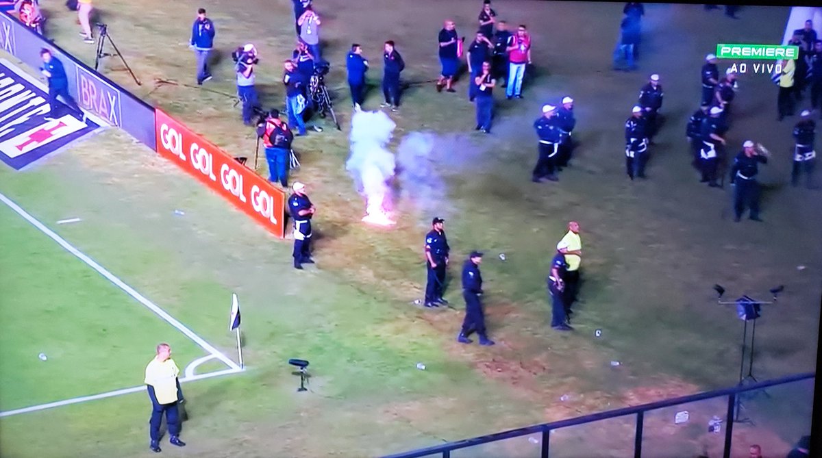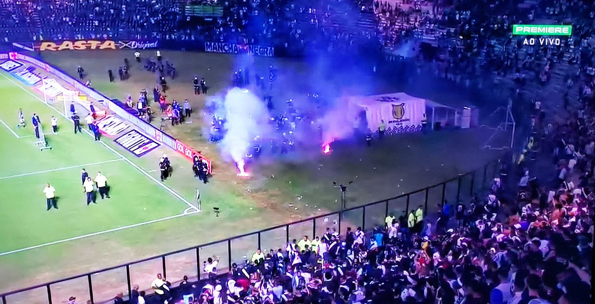 Fogos de artifício, copos e objetos sendo arremessados no gramado de São Januário.