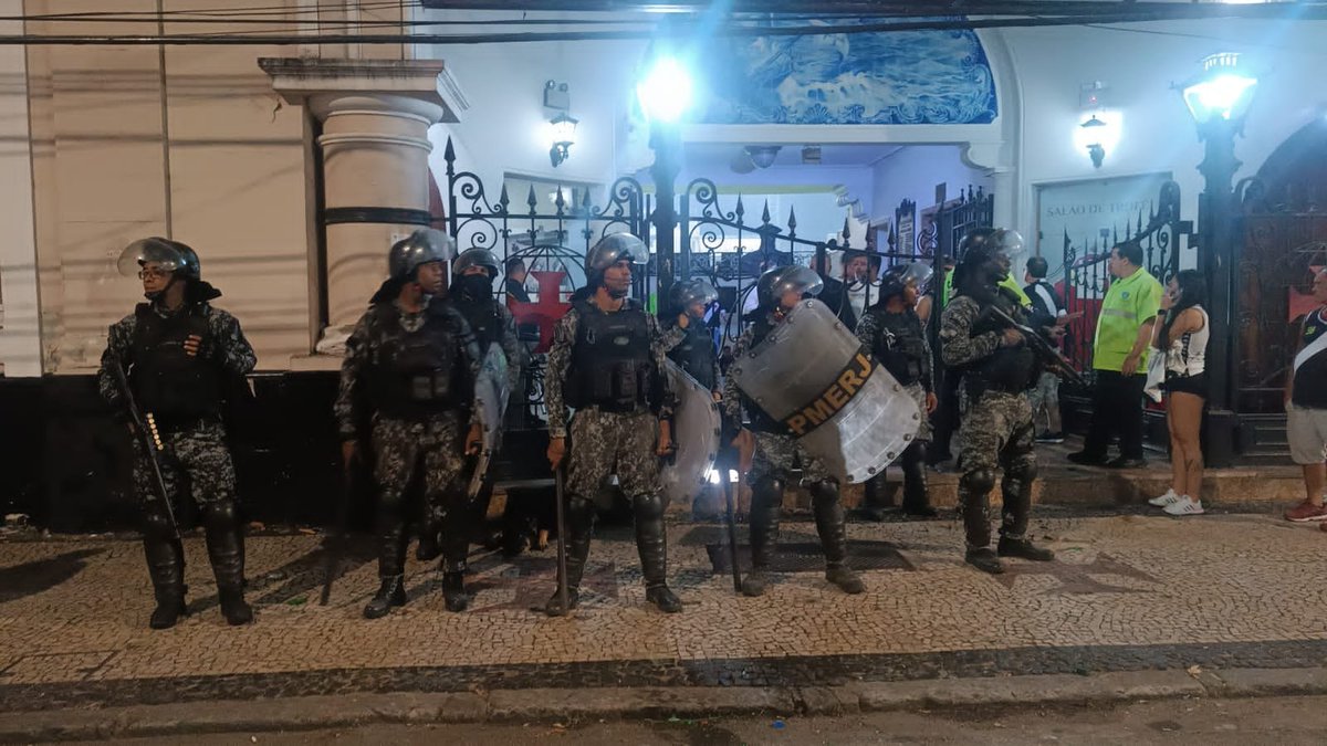 Policiais militares do #BEPE, do #BPChq e do #RPMont estão a postos em São Januário, onde ocorreu a partida entre @VascodaGama e @goiasoficial. Torcedores descontentes com o resultado do jogo iniciaram um tumulto, mas rapidamente foram contidos. (+)