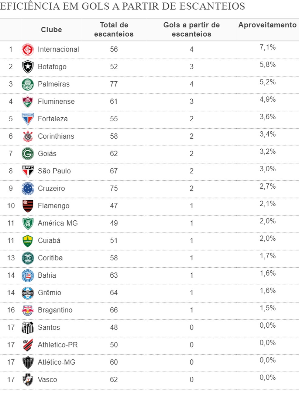 O Internacional é a equipe mais eficiente nesse tipo de jogada. Teve 56 escanteios a favor e a partir dessas cobranças marcou quatro gols, dois em cobranças da esquerda e dois em cobranças da direita, todos em jogadas aéreas. O Internacional já venceu o Goiás e o Vasco em casa, além de ter empatado com o Santos fora de casa abrindo o placar com gol a partir de escanteios.