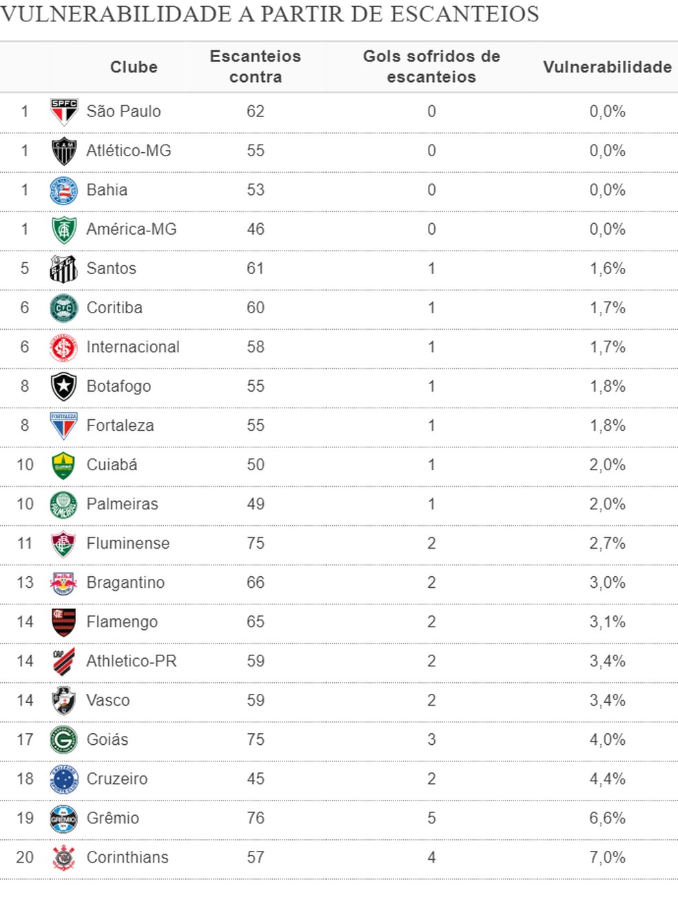 A equipe mais vulnerável em escanteios no Campeonato Brasileiro é o Corinthians, que sofreu quatro gols em 57 cobranças, uma vulnerabilidade de 7%. O time que mais levou gols assim foi o Grêmio, com cinco gols sofridos, uma vulnerabilidade de 6,6% em 76 escanteios cedidos. É a equipe que mais cedeu escanteios, com um a mais do que Fluminense e Goiás.