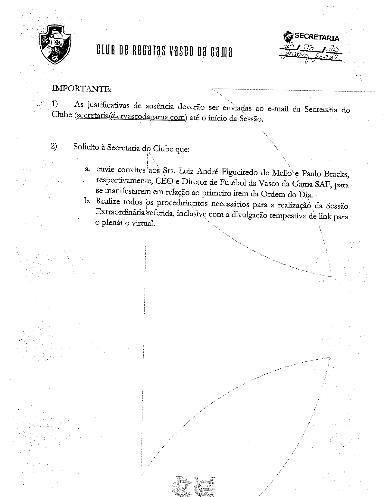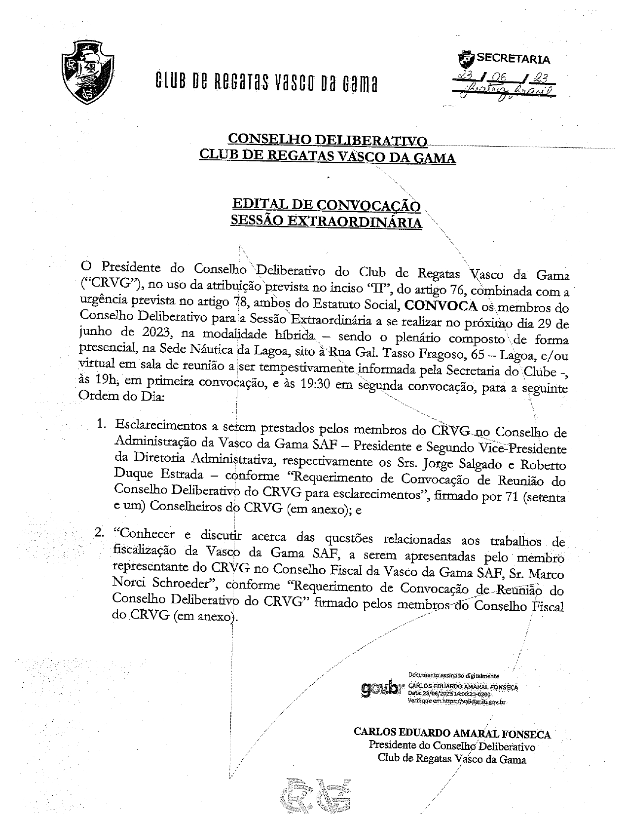 Veja a convocação para a reunião de 29/06 do Conselho Deliberativo do Vasco