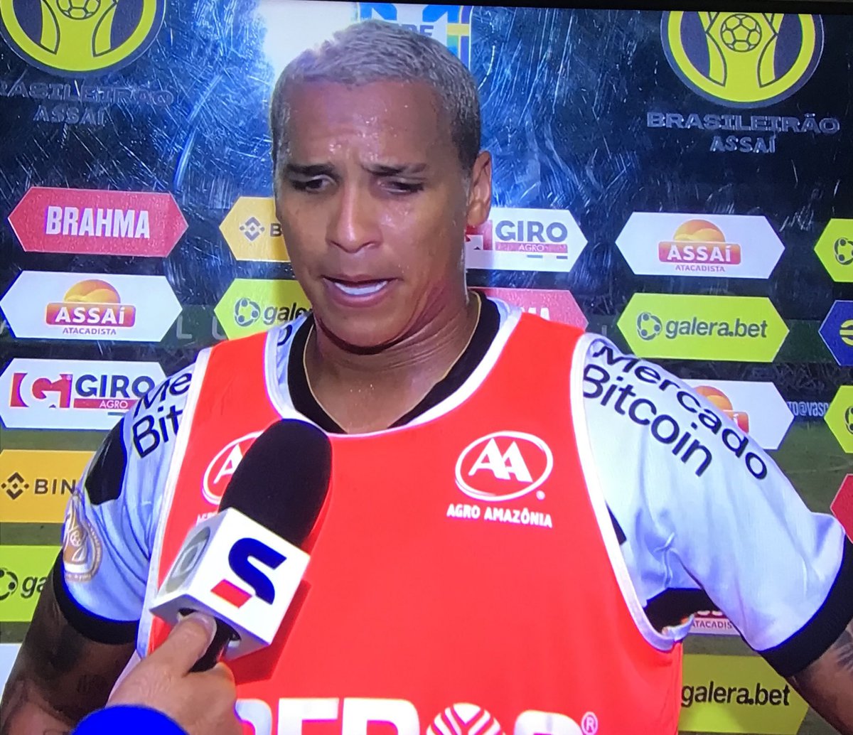 Atacante do Cuiabá, Deyverson colocou a camisa do Vasco para dar entrevista no intervalo