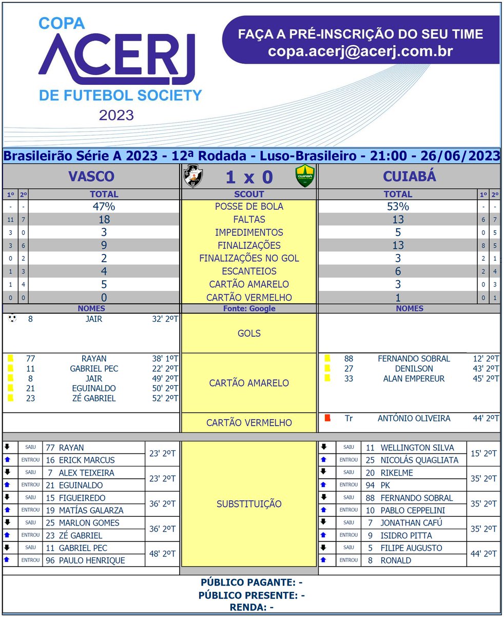 Cartões amarelos: Rayan, Jair, Eguinaldo, Zé Gabriel e Gabriel Pec (Vasco); Fernando Sobral, Empereur e Denílson (Cuiabá)