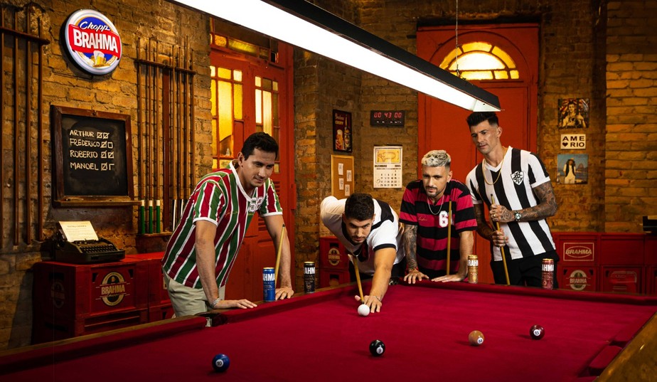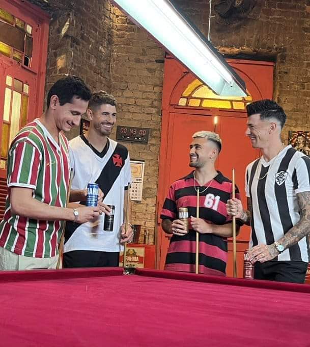 Quatro jogadores, um de cada time grande do Rio, se reuniram para uma campanha publicitária de uma cervejaria. Arrascaeta (Flamengo), Ganso (Fluminense), Pedro Raul (Vasco) e Victor Cuesta (Botafogo) posaram com as camisas retrô dos clubes jogando sinuca.