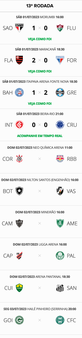 Quatro jogos abriram a 13ª rodada do Campeonato Brasileiro neste sábado. Atual 18º colocado, o Vasco enfrenta o líder Botafogo neste domingo às 16h.
