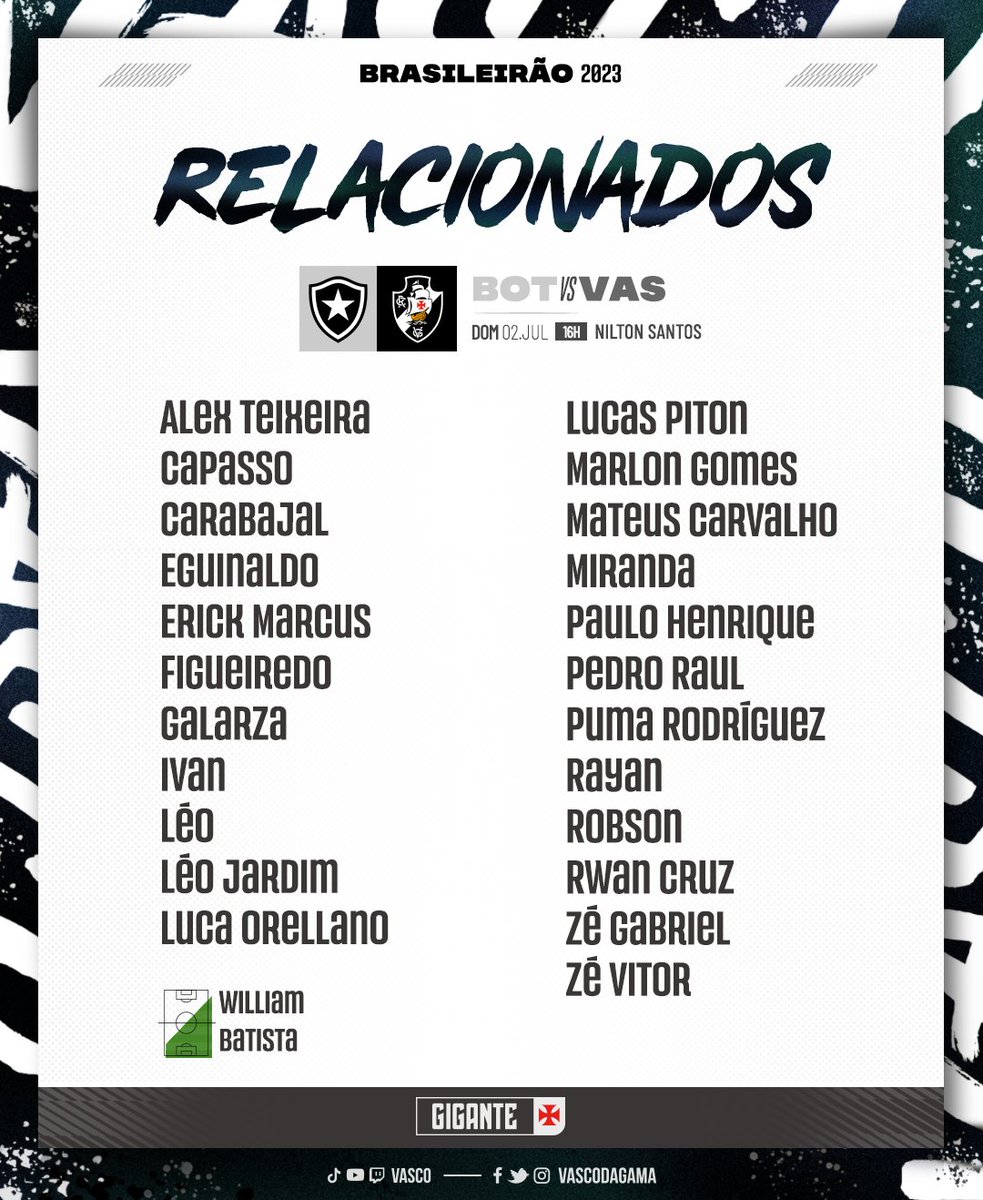 Confira os relacionados do Vasco para o jogo contra o Botafogo