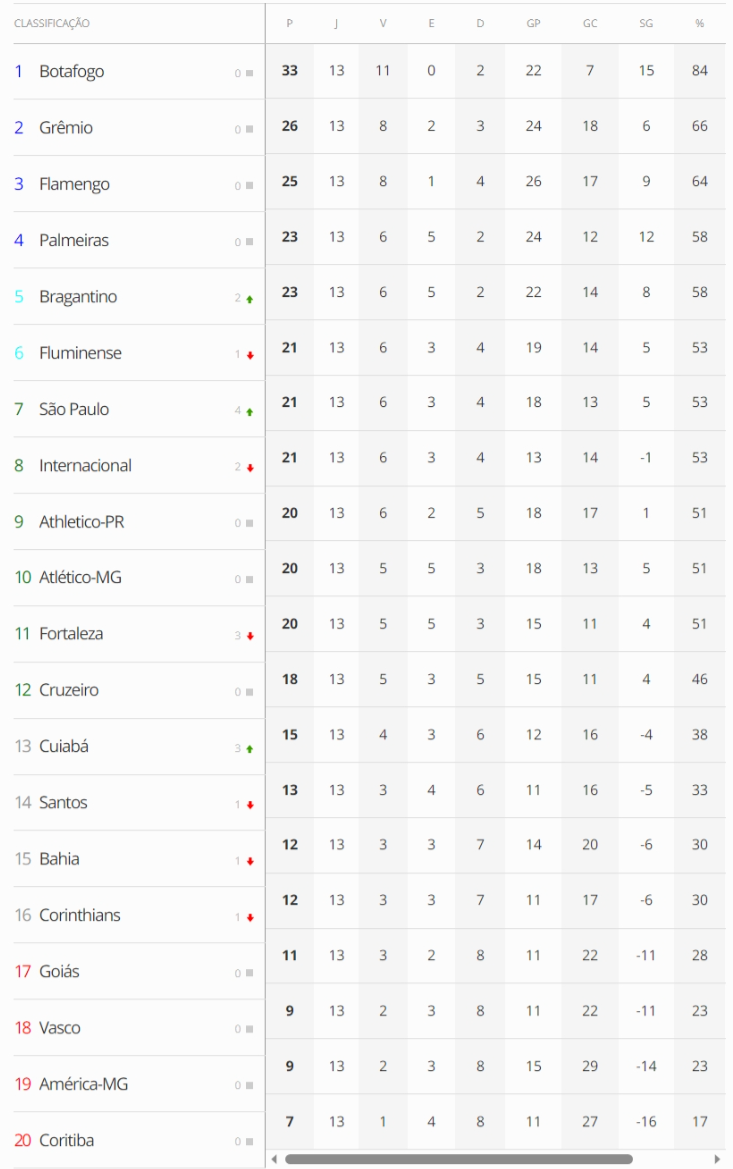 Terminada a 13ª rodada do Brasileiro, o Vasco, que perdeu para o Botafogo por 2 a 0, manteve-se na 18ª e antepenúltima colocação e a 3 pontos do 1º time fora do rebaixamento (agora o Corinthians), mesma situação que apresentava ao fim da rodada anterior.
