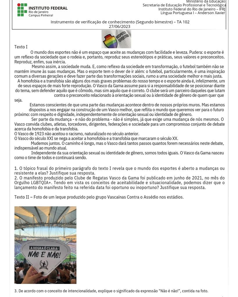 Simplesmente o Vasco sendo tema de uma pergunta da prova do IFRJ.