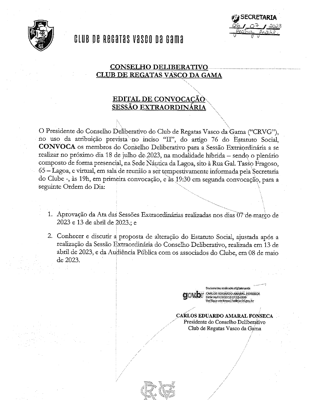 24/06/23 - Veja a convocação para a reunião de 29/06 do Conselho Deliberativo do Vasco