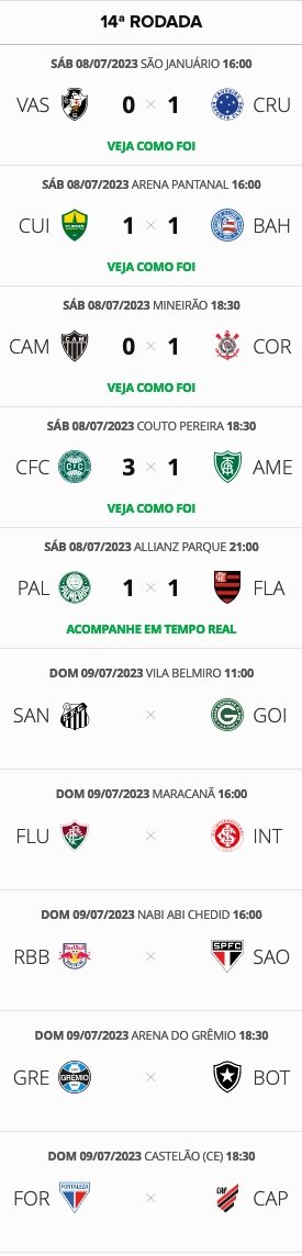 Cinco jogos abriram a 14ª rodada do Campeonato Brasileiro neste sábado. O Vasco, que perdeu para o Cruzeiro por 1 a 0 em São Januário, foi ultrapassado pelo Coritiba, que venceu o América-MG por 3 a 1, e agora está na 19ª colocação.