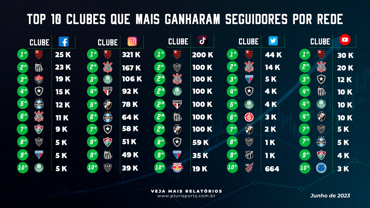 Flamengo foi o clube que mais ganhou seguidores em todas as redes sociais no mês de junho. Atual líder do Brasileirão e impulsionado pela boa campanha dentro de campo, o Botafogo ficou dentro do Top 5 no Facebook, Twitter e Youtube.