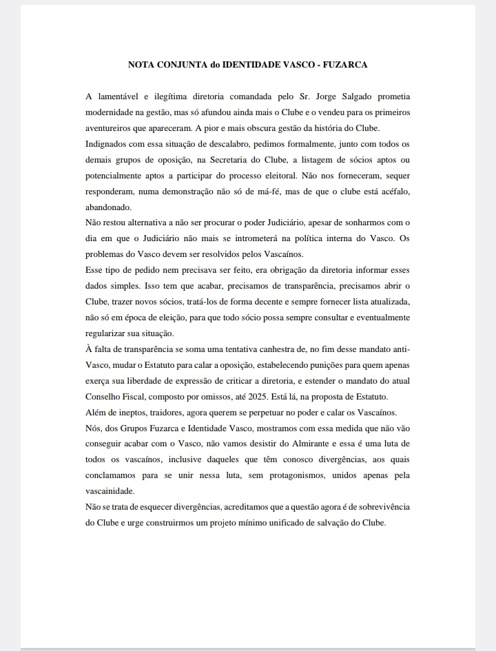 Nós, dos Grupos Fuzarca e Identidade Vasco, mostramos com essa medida que não vão conseguir acabar com o Vasco, não vamos desistir do Almirante e essa é uma luta de todos os vascaínos, inclusive daqueles que têm conosco divergências, aos quais conclamamos para se unir nessa luta, sem protagonismos, unidos apenas pela vascainidade.