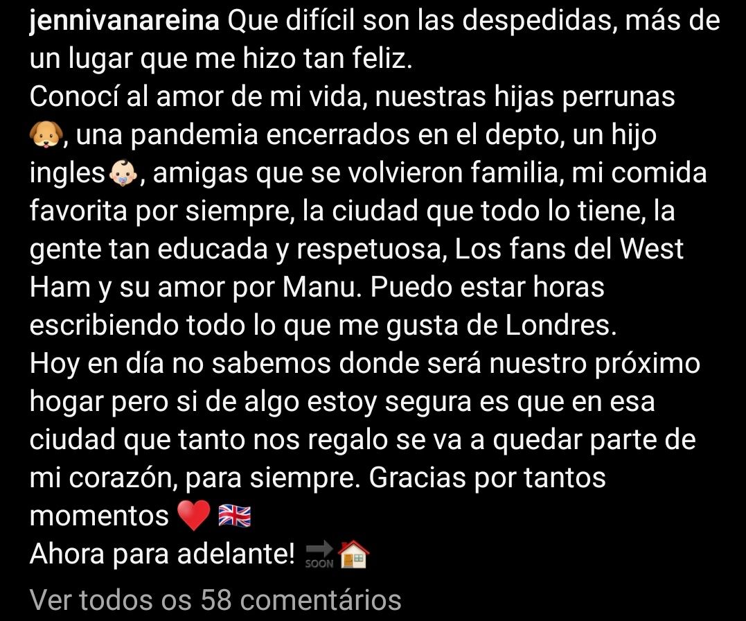 Jennifer Reina, esposa de Manuel Lanzini, postou em seu Instagram se despedindo de Londres.