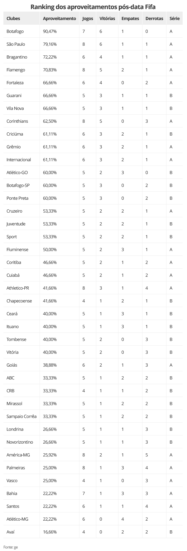 A primeira data Fifa de 2023, que ocorreu entre os dias 12 e 20 de junho, concedeu para os clubes do futebol brasileiro um intervalo de pouco mais de 10 dias sem partidas oficiais. Quem melhor desfrutou a pausa foi o Botafogo, que obteve, até aqui, 90,47% de aproveitamento. Por outro lado, agremiações importantes no cenário do país, como Avaí (16,66%), Atlético-MG (22,22%), Palmeiras (25%) e Vasco (25%) despencaram em suas respectivas tabelas.