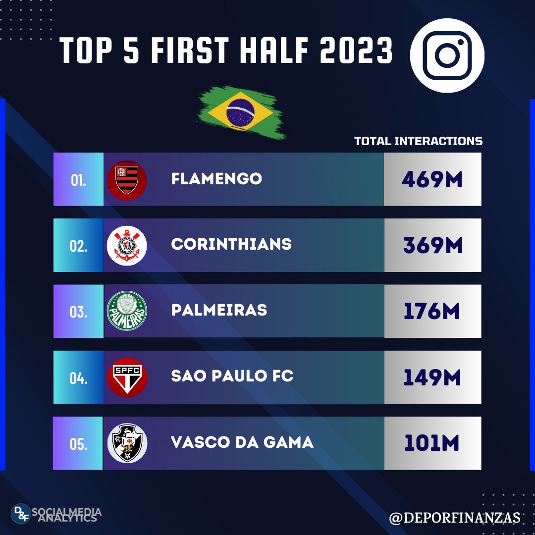 📲⚽🇧🇷 Os 5 clubes brasileiros com mais engajamento no #instagram durante o primeiro semestre de 2023!