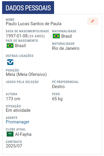 Paulinho Paula começou na base do Fluminense e tem passagens por Sporting-POR Boavista-POR; veja ficha